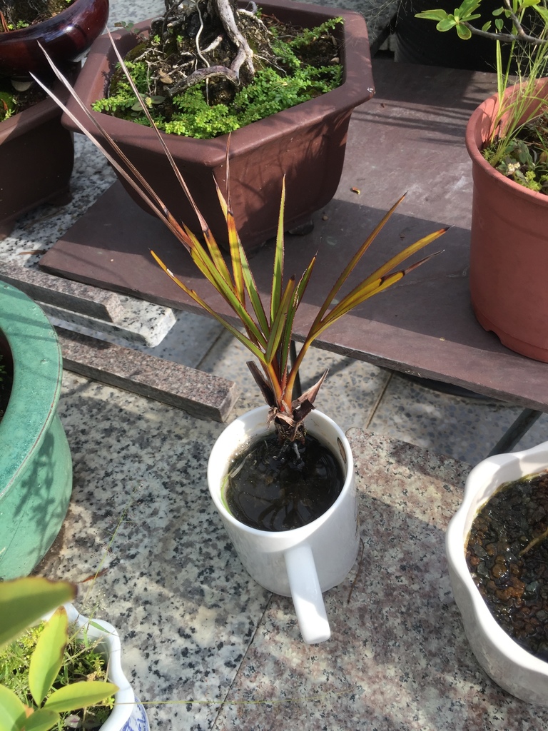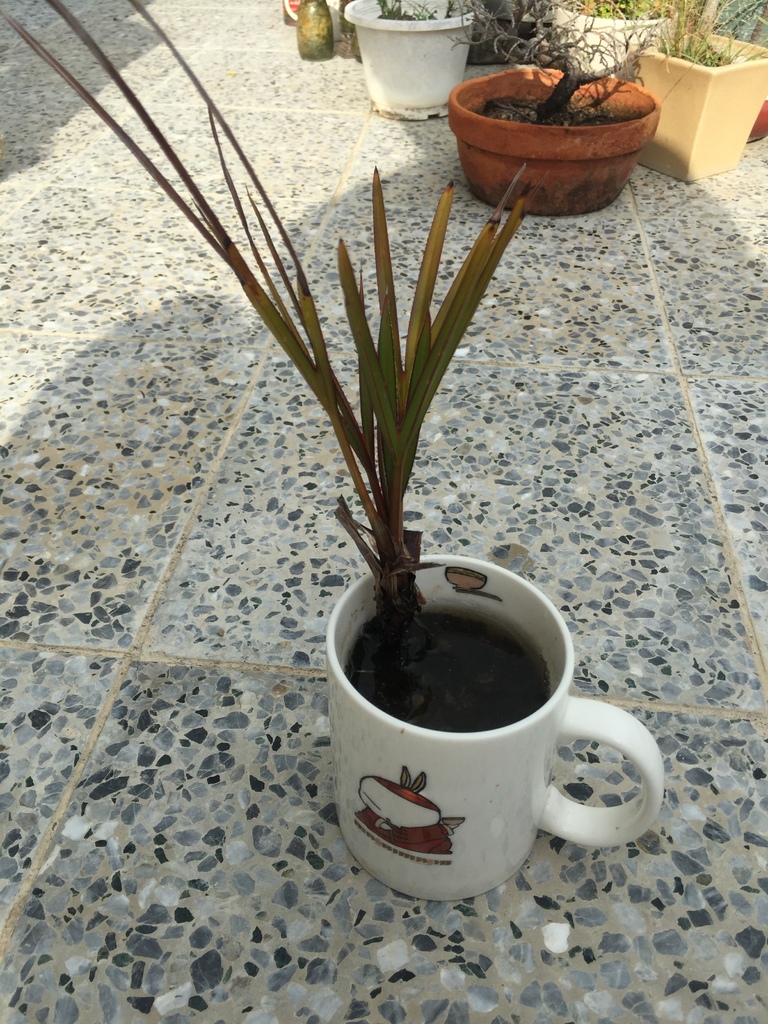 以下這盆"紅棕櫚"種子盆栽,是從種子孵芽而成,且種植在馬克杯裡的種子盆栽,但後來拿到頂樓花園,擺在戶外,任它成長,但它一直長不好,很容易就有枯葉,可能是沒洞的馬克杯,裡面雖然有水,但頂樓很熱,裡面的水溫可能很高,不利盆栽的生長,所以在7月份時,我就把它種到大盆子裡,由麥飯石水耕,改為土耕,希望它能長好一點,之後再進行移盆,移到適合且好看的盆器中,再成為一盆"紅棕櫚盆栽"。