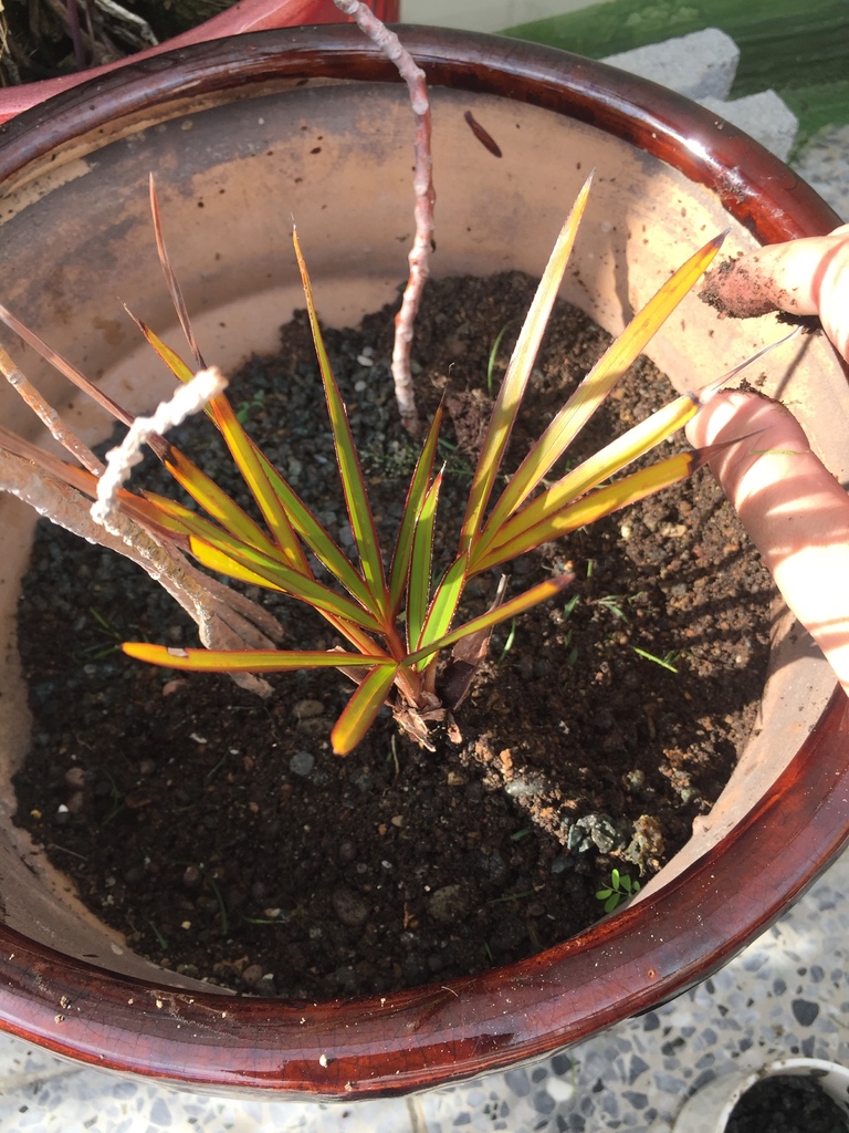 重新種下的紅棕櫚,目前在大盆器裡,已經有順利長出新葉,想信不久它成愈長愈好看,那時候我會把它種到新的盆器裡,成為一盆新的"紅棕櫚盆栽",到時候再PO文分享。