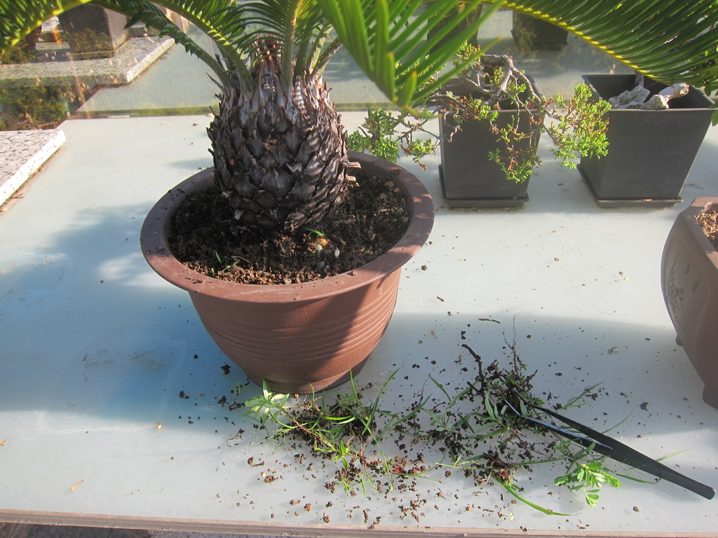 我家的蘇鐵(鐵樹)盆栽都是從種子盆栽開始種植的,也已經好多年了,蘇鐡在戶外生長的存活率很高,只要盆器夠大,它就能長得很大很強健,但如果給它小小的盆器,它就長不大,但是日子久了,它還是會硬生生的長大,底下盆器也可能"爆盆",以下這盆就是這樣,好多年沒整理及換盆了,這回在4月份就幫它整理一下,根部修剪及移盆。經過了3個月後,它長的特別好,我再做一次除草。
