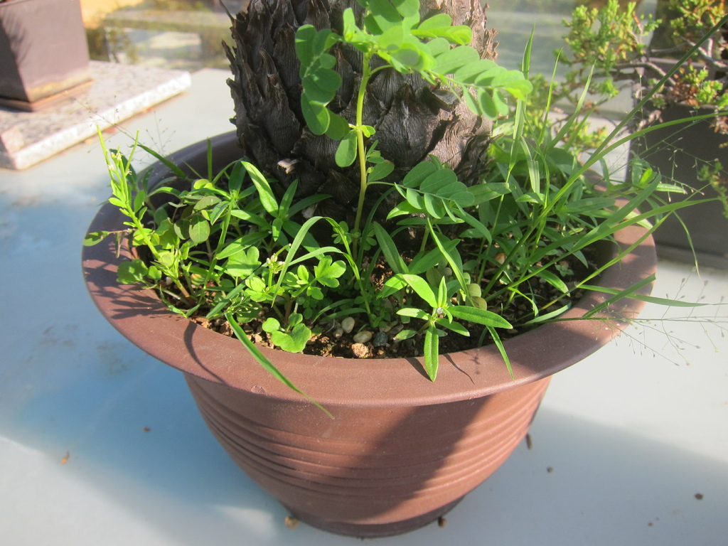 ▼蘇鐵盆栽裡~雜草長了不少