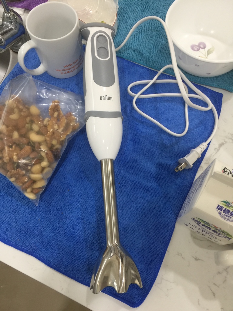 最近因疫情關係,假日幾乎都宅在家,於是上網看影片,自己DIY學做一些餅乾、冰淇淋、饅頭...,過程中,也新添購了一些工具,其中一個好用的工具就是"德國百靈手持式攪拌棒",我買的是MQ5035,中間這一款,不是陽春的MQ5000,也不是全配MQ5045,這個手持式攪拌棒用來打蛋白、打鮮奶油,都很快速,也可以做濃湯(南瓜一下子就打散了)。這回我拿來打堅果,做牛奶堅果飲,當早餐的飲品,感覺不錯,一下子就打碎,以下這個分享照片,是我第一次做的時候拍的,用最慢速段,不到10秒鐘,就打好了,但喝起來有顆粒感,要再咬一下,後來我又做了幾次,用最慢速打個20~30秒,幾乎就不用咬了,顆粒很小,效果很好。