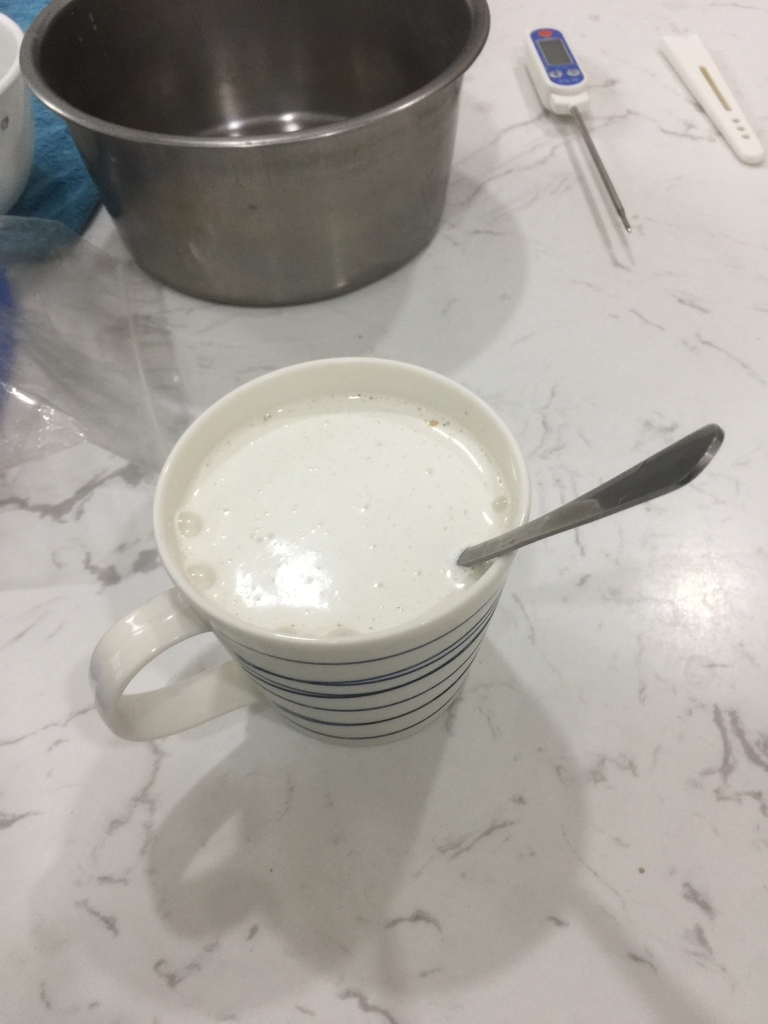 ▼打好了~再加一些牛奶,做成一杯牛奶堅果飲~
