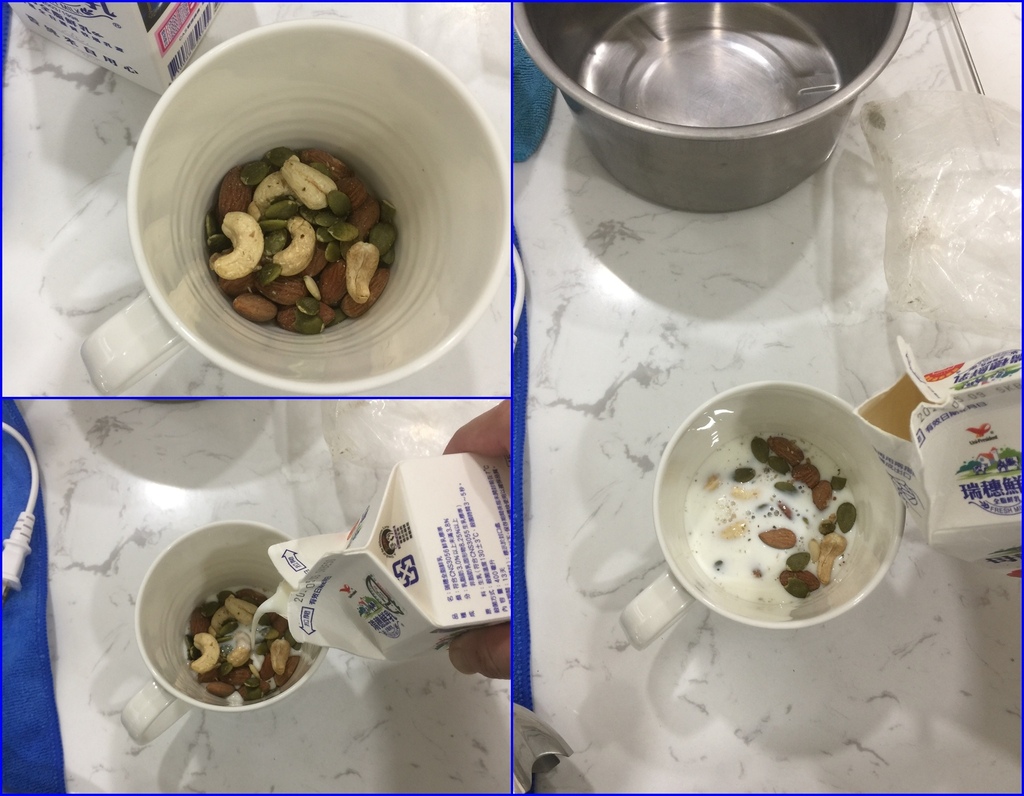 ▼牛奶(不要太滿~1/3杯,蓋過堅果即可)+堅果