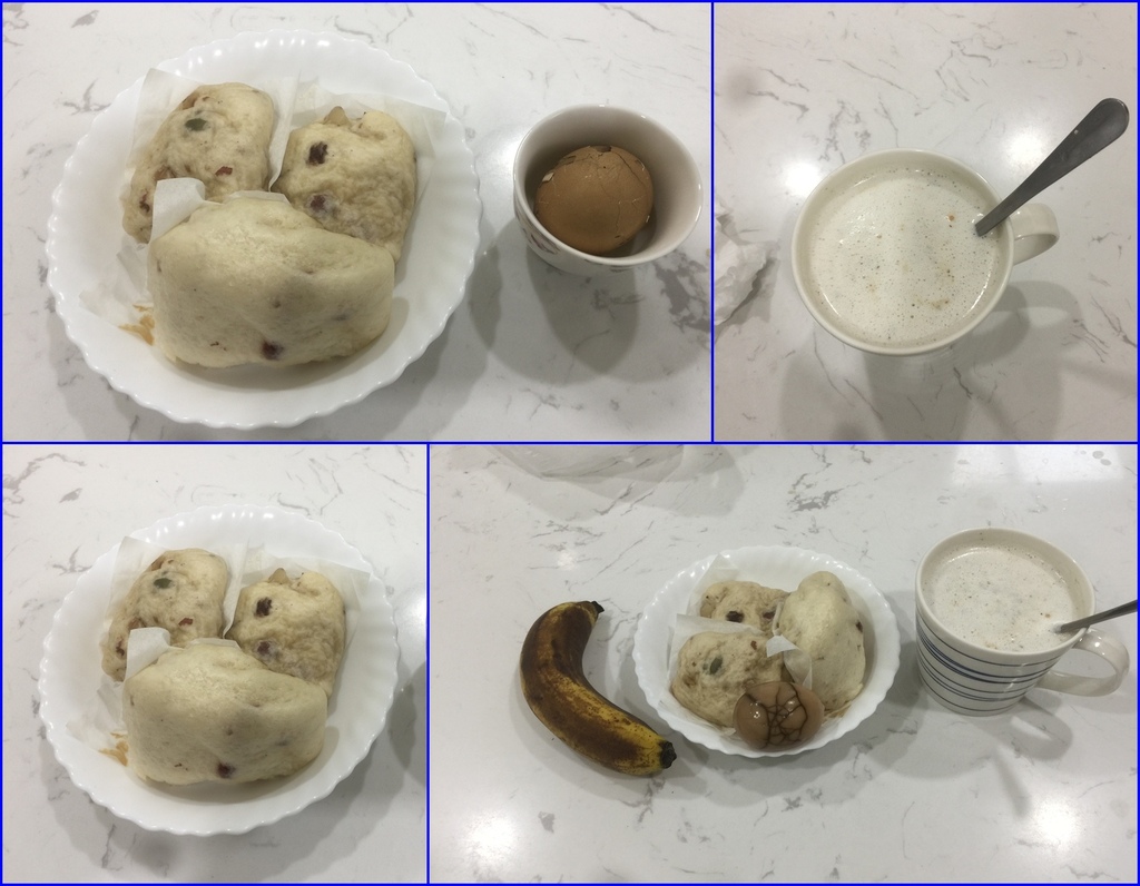 ▼這天的早餐~饅頭(自己做的)+茶葉蛋+香蕉(過熟)+牛奶堅果飲